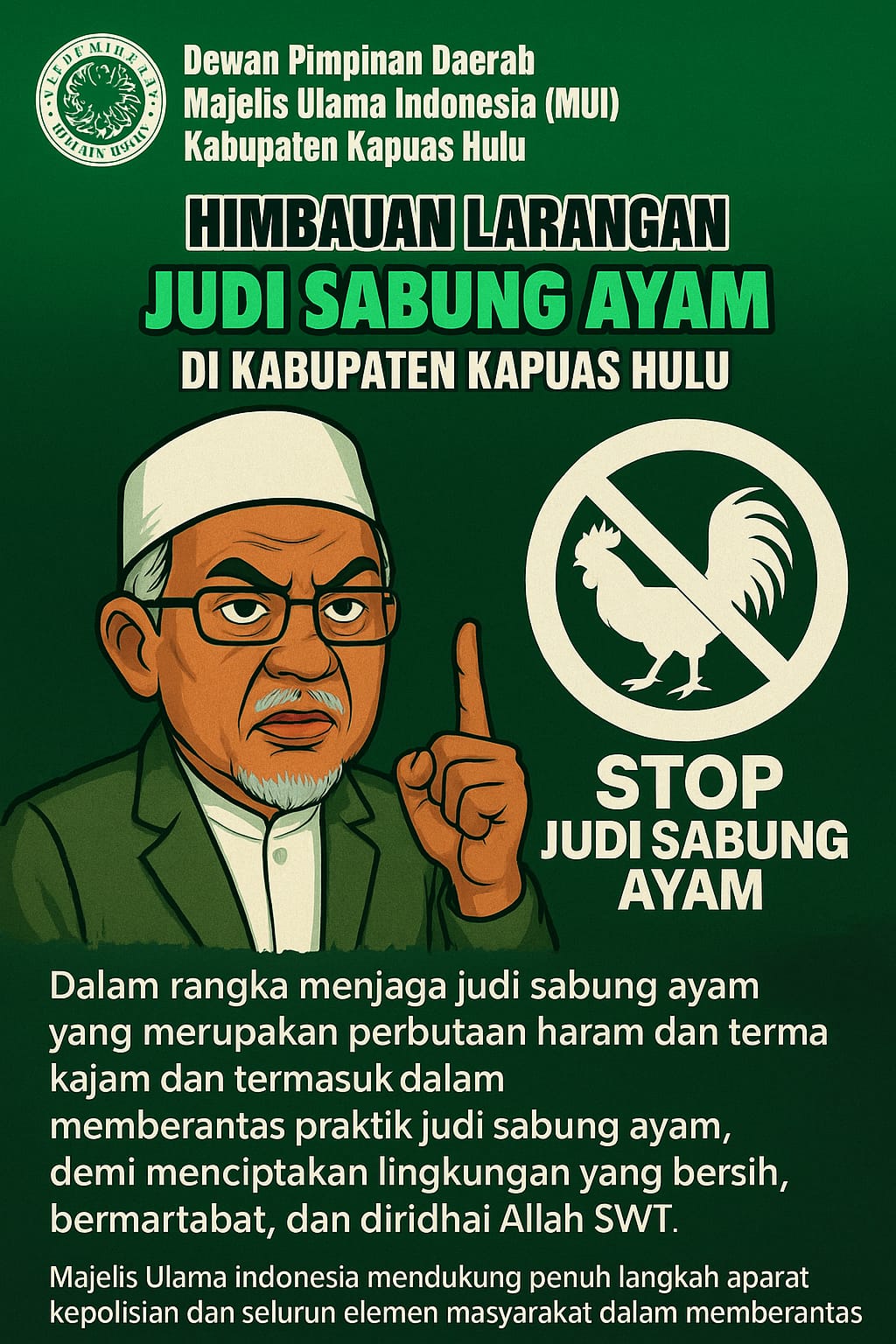 Dalam imbauannya, MUI Kapuas Hulu menegaskan bahwa sabung ayam adalah perbuatan haram dan keji menurut syariat Islam, serta mengancam ketenteraman sosial.