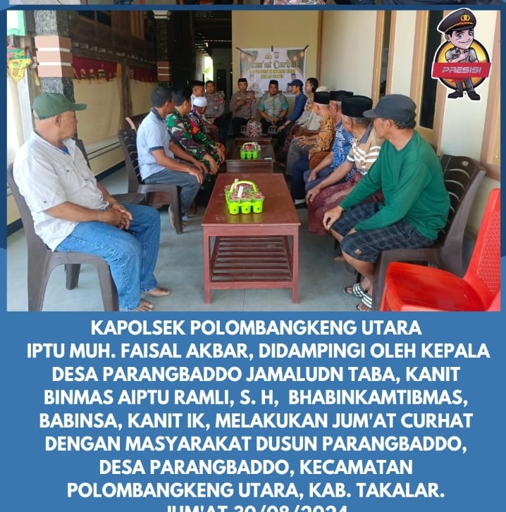 RavaNews,TAKALAR— Belum sepekan menjabat Kapolsek Polongbangkeng Utara Iptu Muh. Faisal Akbar, melaksanakan Jum’at Curhat yang bertempat di Dusun Parang Baddo, Desa Parang Baddo, Kecamatan Polongbangkeng Utara, Kabupaten Takalar, (30/08/2024).