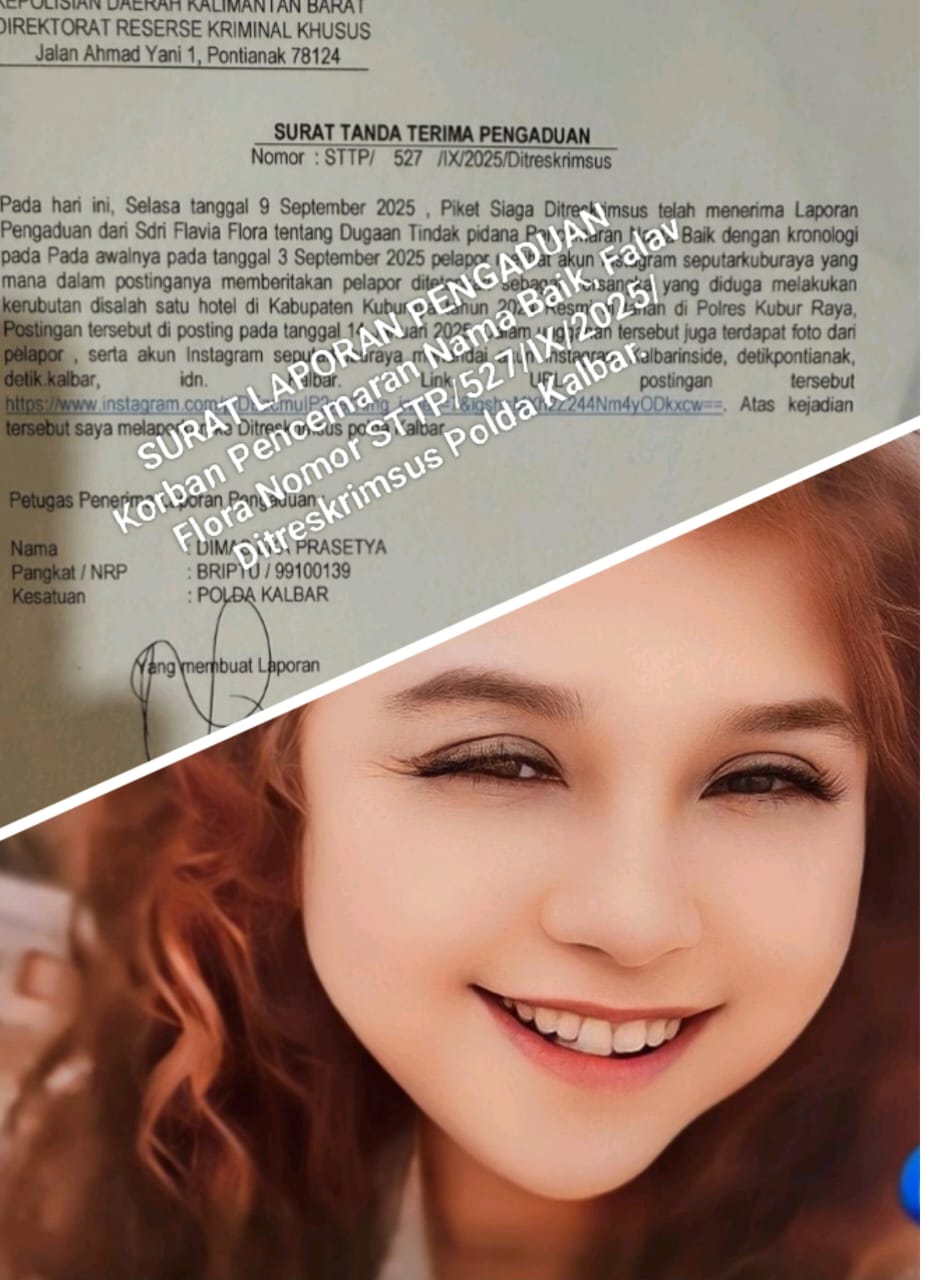 Direktorat Reserse Kriminal Khusus (Ditreskrimsus) Polda Kalimantan Barat menerima laporan dugaan pencemaran nama baik dari seorang warga bernama Falavia Flora, pada Selasa (9/9/2025). Laporan resmi tersebut tercatat dengan nomor STTP/527/IX/2025/Ditreskrimsus Polda Kalbar.