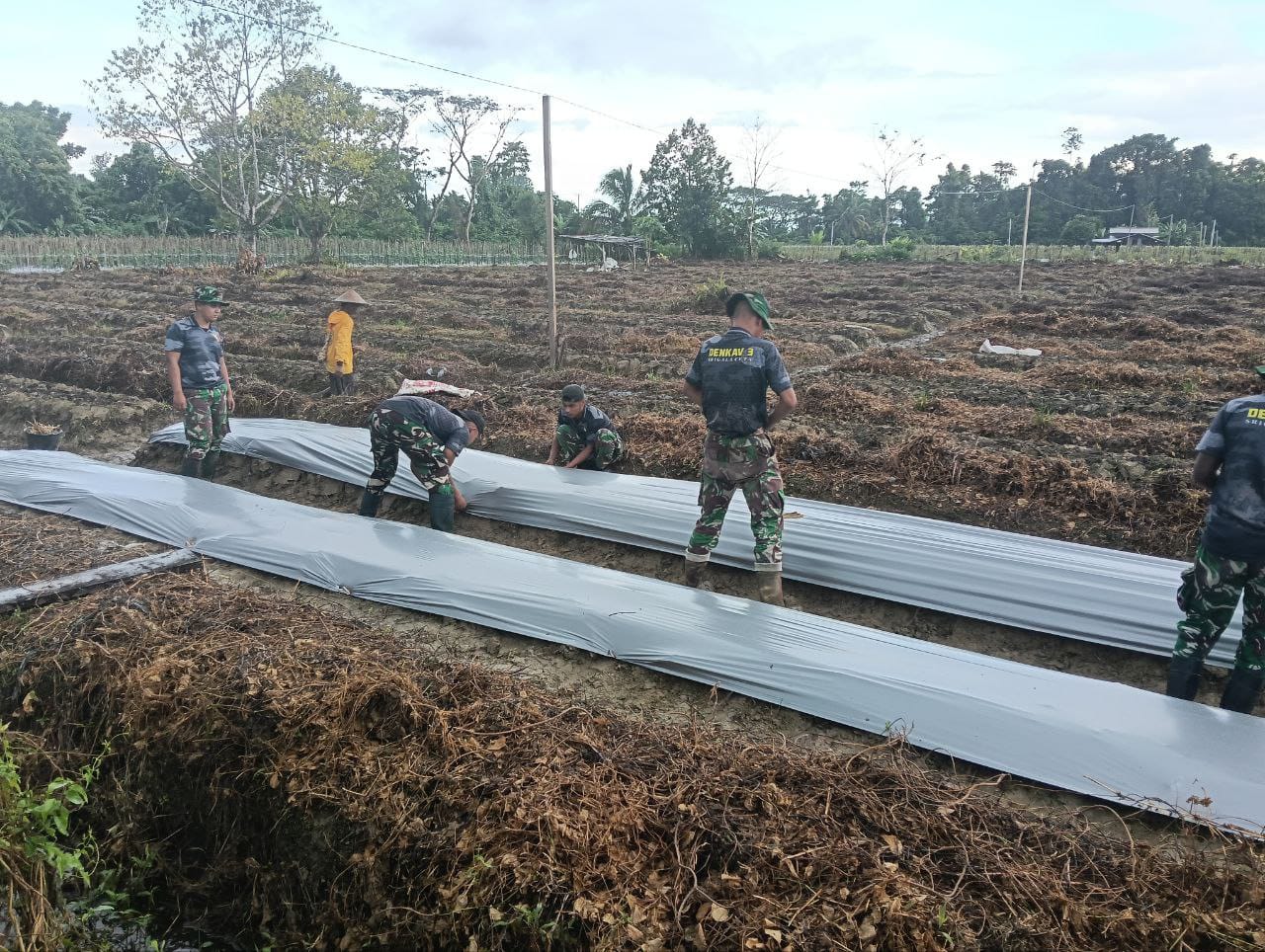 Rava News | Timika – Personel Satgas TMMD 124 Kodim 1710/Mimika bersama warga dari Kelompok Tani (Poktan) “Noken Naena” melaksanakan pembersihan dan pemasangan Plastik Mulsa lahan ketahanan pangan untuk mengejar target tanam, bertempat di lokasi pembukaan lahan tidur di Kp. Nena Muktipura, Distrik Iwaka Kab. Mimika, Sabtu (24/05/2025).