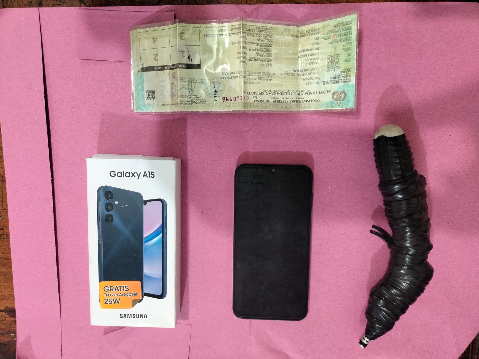 Dari tangan pelaku, polisi menyita: 1 unit HP Android Samsung Galaxy A15 warna Blue Black, 1 buah senjata mainan menyerupai pistol dan 1 lembar STNK sepeda motor Yamaha BE 2178 EL milik korban